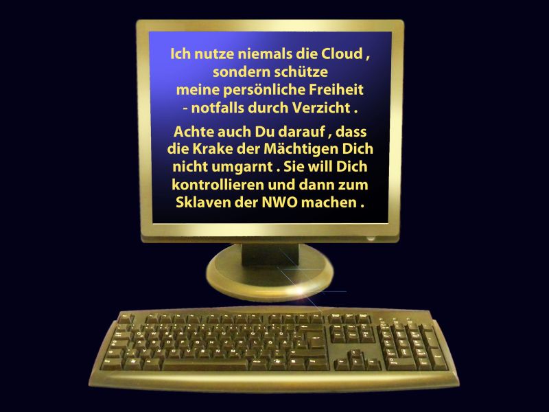 Mit Cloud-Computing - eines der großen Schlagworte - soll ein neuer riesiger Markt, der horrende Gewinne verspricht, erschlossen werden. Was sich wirklich hinter dem Cloud-Computing verbirgt, welche Ziele in Wahrheit damit angestrebt werden und welche Autorität sich dahinter verbirgt soll auf dieser Seite untersucht und dargelegt werden. |